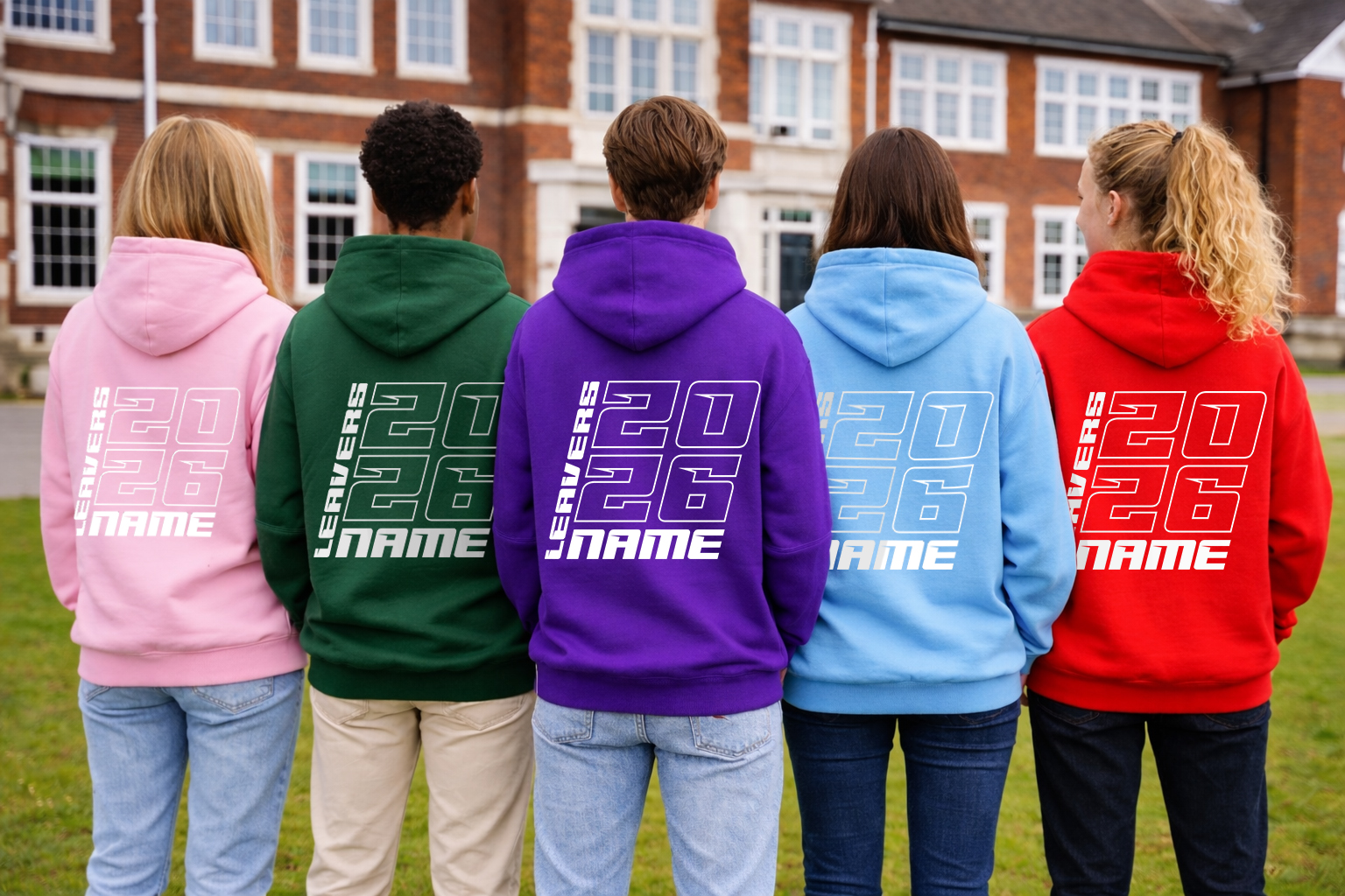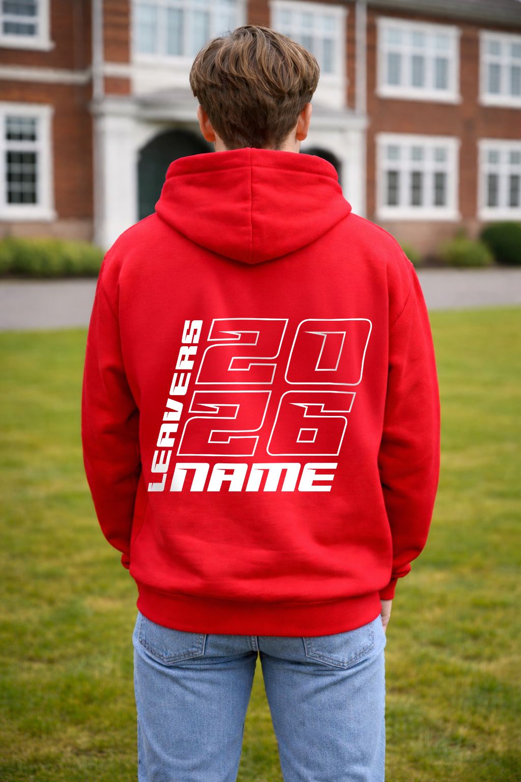- Large back print with 2026, NAME and LEAVERS