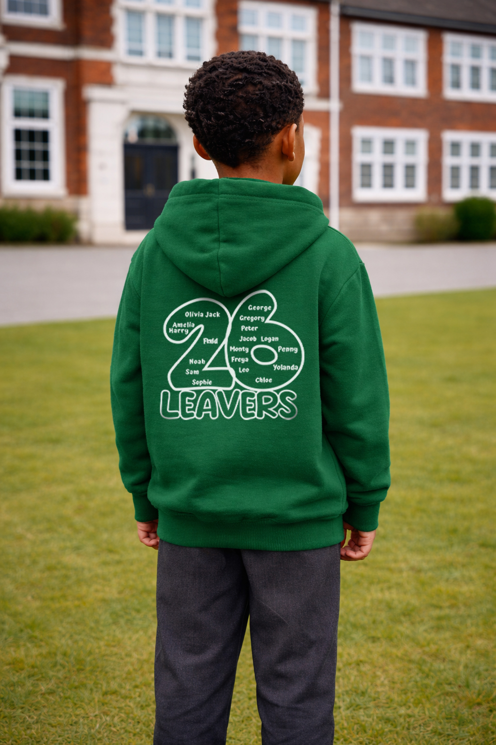 - Large back print featuring LEAVERS, YEAR, and CLASS NAMES within a 26-name frame