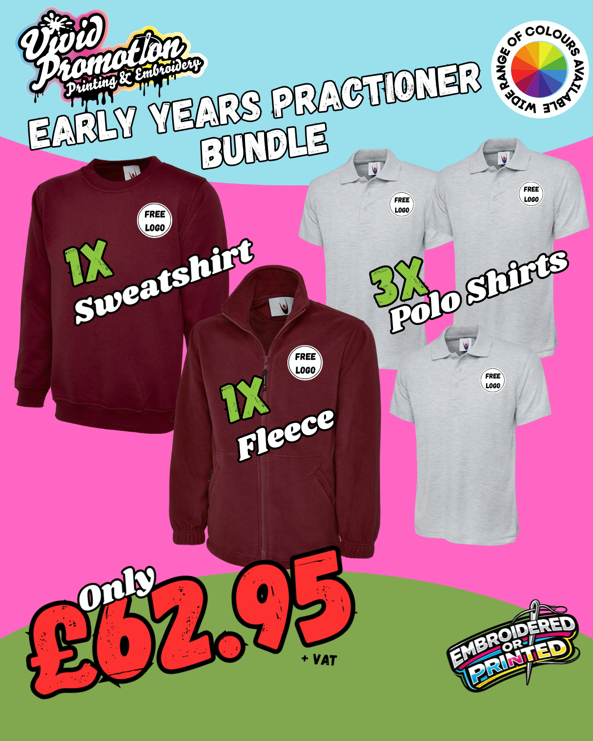Bundle price: £62.95 + VAT – a practical uniform kit for 1 member of staff, ideal for nursery and early years teams.
