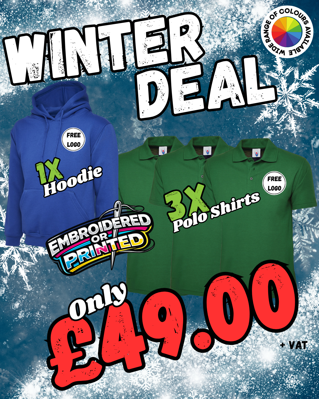 Choose your sizes, pick your garment colours, upload your logo, and we’ll take care of the rest. With 3x Uneek UC101 polo shirts and 1x Uneek UX4 hoodie, plus free logo setup and your choice of print or embroidery, this is an easy win for any business that wants to look the part this winter.